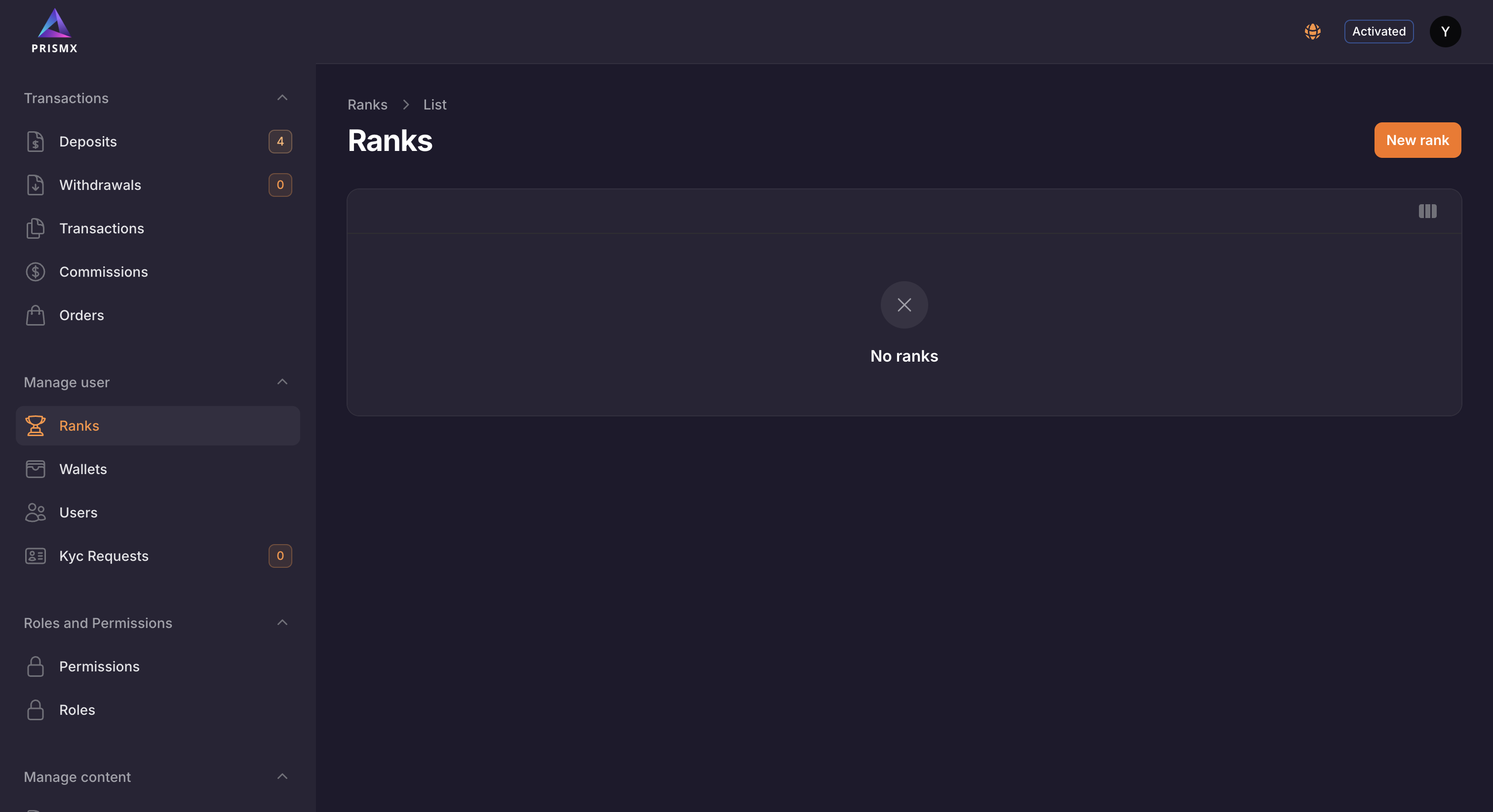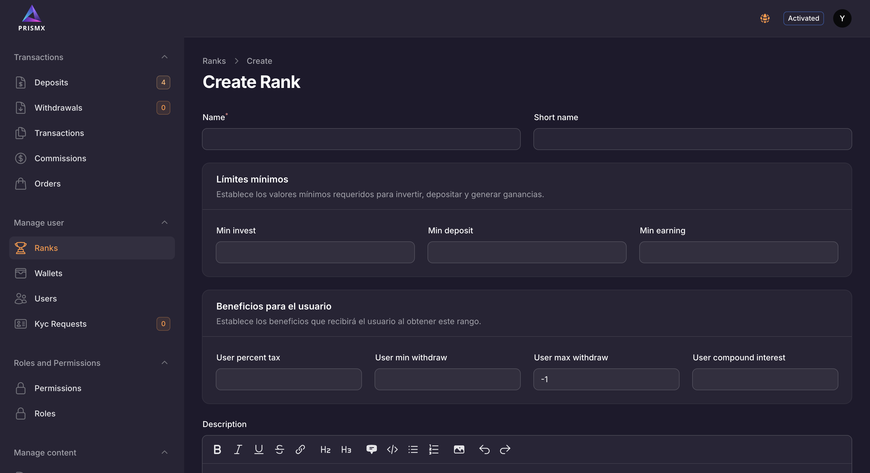 Asciende a tus usuarios según su actividad (inversiones, depósitos o ganancias). Personaliza los requisitos y beneficios de cada rango (Ej: "Silver", "Gold", "Diamond") para fidelizar a tus inversores.