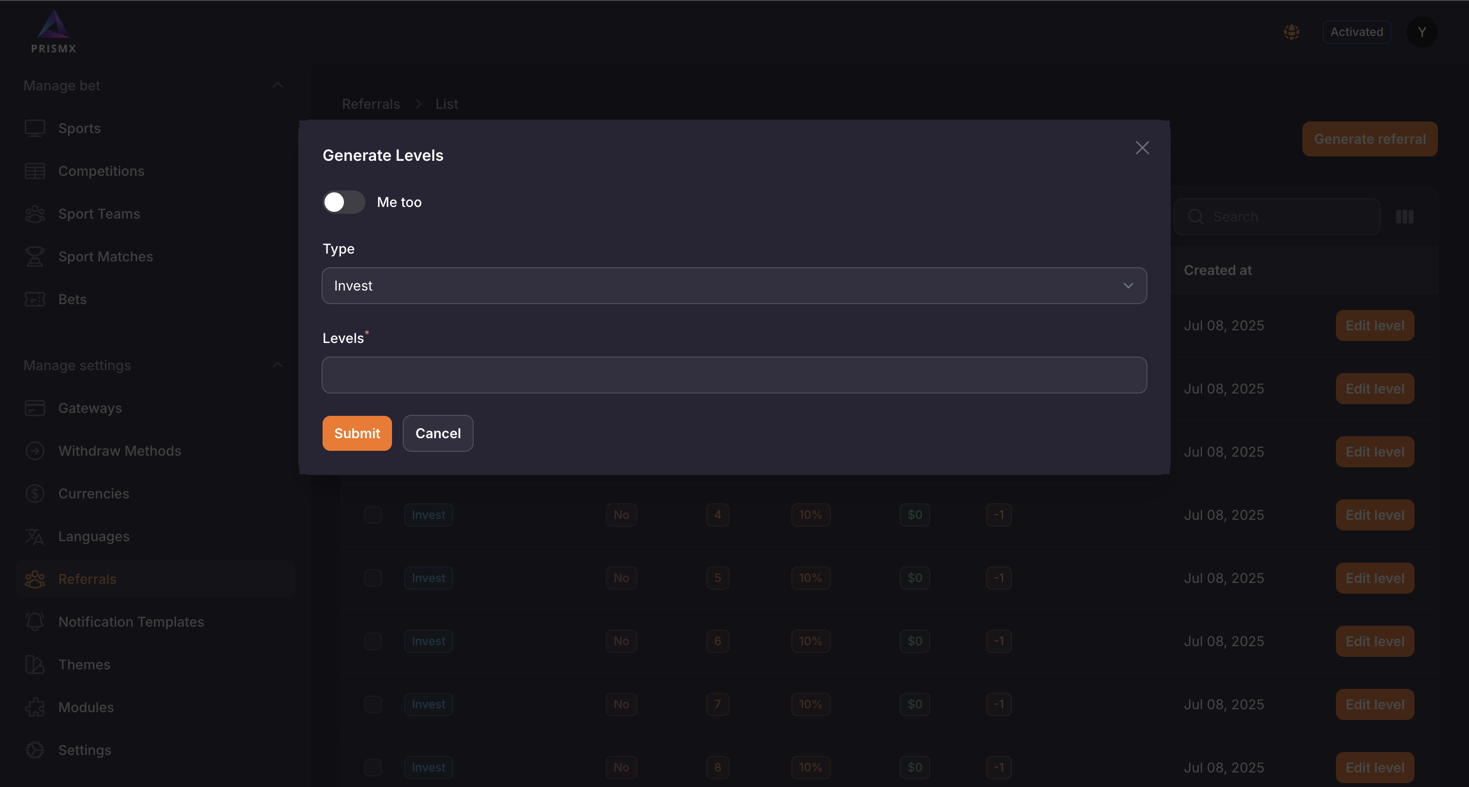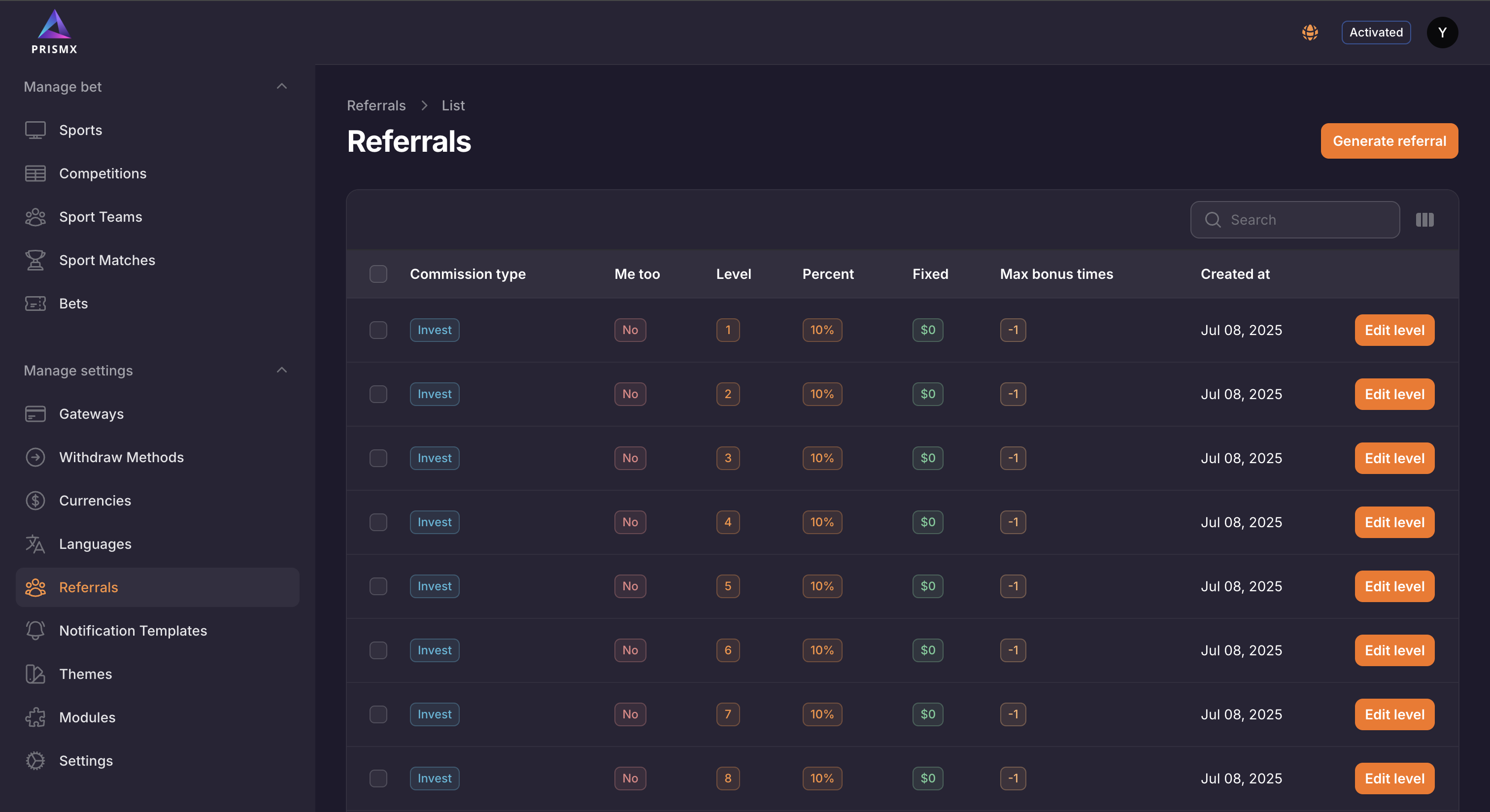 Configura hasta 10 niveles de referidos o más con recompensas variables (ej: 5% en nivel 1, 2% en nivel 2). Atrae más inversores de forma orgánica.